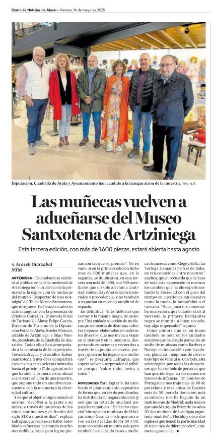 El periódico Noticias de Álava se hace eco de la inauguración de la exposición Despertar de una nostalgia del Taller Museo Santxotena de Artziniega. Araceli Oiarzabal entrevista a Teresa Lafragua, comisaria de la exposición, desvelando detalles de algunas de las más de 1.600 muñecas expuestas y su planteamiento museográfico. Puedes leer la noticia en el siguiente enlace. 15/05/2025